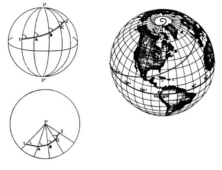 Em sumária explicação, qualquer ponto na Terra pode ser localizado por um ângulo de Latitude combinado com outro ângulo de Longitude. A Latitude define o ângulo vertical, Norte Sul, que especifica a distância daquele ponto em relação ao Equador. Aqui ele é sinalizado como um número Positivo para o hemisfério Norte e Negativo para o hemisfério Sul. Por outro lado, a Longitude define o ângulo horizontal, Leste Oeste, que determina a distância do ponto em relação ao meridiano que passa pela referência convencionada como sendo a cidade de Greenwich na Inglaterra. Sinalizamos com um número Positivo os pontos a Leste de Grenwich e com um número Negativo os pontos a Oeste. Sobre a superfície do nosso planeta, as linhas de referência imaginárias horizontais, de Latitude, que marcam os ângulos verticais, são denominados Paralelos. E as linhas de referência imaginárias verticais, de Longitude, que marcam os ângulos horizontais, são denominadas Meridianos. Em síntese, Longitude é a distância angular entre um ponto qualquer da superfície terrestre e o meridiano inicial em Greenwich. Latitude é a distância angular entre um ponto qualquer da superfície terrestre e a linha do Equador. Posto isto, seguimos em uma breve explicação sobre trajetórias. Após o disparo, uma trajetória pode ser feita por meio de uma Loxodromia ou de uma Ortodromia. Na Loxodromia, o Rumo do projétil é uma linha que, na Terra, corta todos os Meridianos segundo um ângulo constante. Assim, na superfície da Terra, a Loxodromia é a curva que forma o mesmo ângulo com todos os meridianos. Ela se apresenta como uma espiral que tende para o Pólo. A loxodromia, também chamada Linha de Rumo, ou simplesmente Rumo entre dois pontos, é a linha que une estes dois pontos cortando todos os meridianos segundo um mesmo ângulo: A imagem abaixo exemplifica uma trajetória Loxodrômica com Rumo de 60 graus. Note que todos os meridianos são cortados pelo mesmo ângulo: A Loxodromia não corresponde a trajetória de menor distância entre dois pontos. A menor distância, também pela superfície, é denominada Ortodromia. Na alternativa da trajetória Ortodrômica, o míssil percorre uma linha reta, mas, devido a curvatura da Terra, precisa ter seu ângulo de rumo original modificado a cada instante. A menor distância entre dois pontos na superfície da Esfera Terrestre é o arco de círculo máximo que passa por estes dois pontos. Tal linha é denominada Ortodromia. O diagrama abaixo ilustra graficamente a diferença entre as trajetórias. A Ortodromia, Círculo Máximo, é a menor distância entre dois pontos, seguindo diretamente pela superfície. Mas, quando no espaço esférico, ela exige mudança constante de Rumo para atingir o destino e corta cada meridiano com ângulos diferentes.: Para pequenas distâncias, a loxodromia e a ortodromia praticamente se confundem. Estes são conceitos próprios de Navegação. A trajetória percorrida por uma embarcação marítima é Loxodrômica. A trajetória percorrida por um avião é Ortodrômica. Na Loxodromia o projétil segue com Rumo constante ao passo que, na Ortodromia, normalmente há um caminho mais curto mas ele exige que o Ângulo de Rumo seja constantemente modificado. Para disparo de um Projétil comum é necessário fazer uso da trajetória Loxodrômica pois ele não possui inteligência própria para se orientar. Uma vez disparado, estará ao sabor das leis da física mecânica. Por outro lado, o disparo de um Míssil teleguiado, telemonitorado, ou orientado por sistema de navegação geodésica, por exemplo baseado em navegação por GPS, pode seguir a trajetória Ortodrômica, ou outra, pois ele tem capacidade para modificar e ajustar seu próprio Rumo. Esta aplicação de software, embora em suas funcionalidades de Cálculos, mostre também o Ângulo Rumo Inicial e a Distância para aplicação da trajetória Ortodrômica, ela visa calcular disparos teóricos para rotas Loxodrômicas. Isto porque, neste programa em particular, é considerado o uso de projéteis sem capacidade de monitoramento ou orientação por sistemas geodésicos. Além disto, como informação adicional, deve-se considerar que, entre dois pontos geográficos da superfície da Terra há duas loxodromias. Este sistema considerará, entretanto, apenas a menor, que corresponde também ao menor caminho em Longitude.