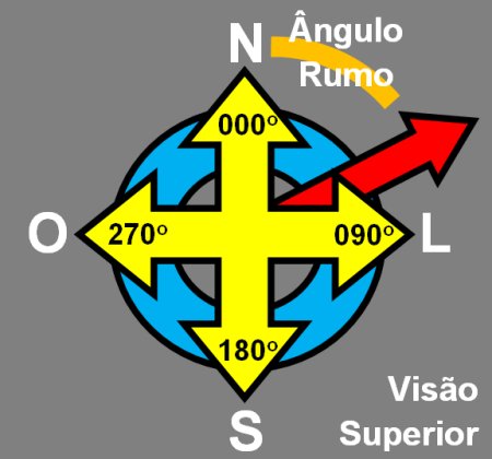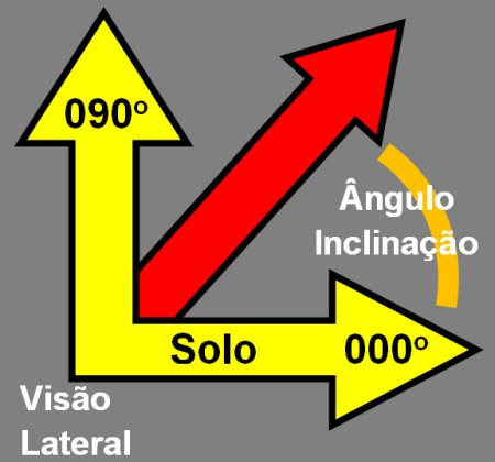 Ângulo de Rumo e Ângulo de Inclinação Esta seção pretende esclarecer sobre os Ângulos que são calculados pelo software e que seriam teoricamente utilizados nos disparos. Escolhidos os pontos de Origem e Destino, a aplicação calcula e mostra a Velocidade Inicial com a qual o projétil deverá ser disparado para, em trajetória Loxodrômica, partir do ponto de Origem e atingir o ponto de Destino. Além da Velocidade Inicial também são computados o Tempo de Vôo do projétil e a Altitude Máxima que ele irá atingir. Fora isto, são calculados Dois Ângulos associados que são o Ângulo de Rumo Loxodrômico e o Ângulo de Inclinação. O Ângulo de Rumo consiste no ângulo visto de cima que deverá ser utilizado para o disparo. A referência é a Visãio Superior do local de origem do lançamento, com o Norte marcado como sendo Zero Graus, computado em sentido horário. Assim, como ilustração, um disparo para o Leste equivale a 90 graus. Para o Sul equivale a 180 graus. Para o Oeste a 270 graus. O diagrama do Ângulo de Rumo segue abaixo: Em tese, para realizar o disparo com perfeição, o Ângulo de Rumo deverá ser estritamente respeitado em uma Visão Superior do lançamento, considerando a orientação do Norte Verdadeiro. Por outro lado, o Ângulo de Inclinação, que não pode ser confundido com o Ângulo de Rumo, corresponde ao da Visão Lateral ao disparo e corresponde à Inclinação inicial do projétil em relação ao Solo. Neste caso considera-se Zero Graus o equivalente ao que seria o disparo horizontal rasteiro ao Solo e 90 graus o equivalente ao disparo para cima, na Vertical. O diagrama do Ângulo de Inclinação está a seguir: Para realizar o disparo, o Ângulo de Inclinação também deve ser estritamente respeitado em uma Visão Lateral do lançamento, considerando o perfeito prumo horizontal em relação ao solo, ainda que o artefato de disparo possa estar montado em carro sobre trilhos. Erros no Ângulo de Rumo resultariam atingir pontos à esquerda ou à direita do alvo de destino correto. E erros no Ângulo de Inclinação resultariam atingir pontos mais próximos ou mais distantes que o alvo final. O botão "Ângulos" existente ao lado direito dos valores calculados, quando no modo de Cálculos, mostrará dois diagramas que indicam os ângulos de disparo. Tanto o ângulo de visão superior, registrado pela Bússola, assim como o ângulo de inclinação lateral: Esclarecemos que, nesta aplicação o Ângulo de Inclinação sempre estará fixado em 45 graus porque este é o ângulo de inclinação mais eficiente, permitindo o máximo alcance horizontal para a mesma carga explosiva e Velocidade Inicial de disparo.
