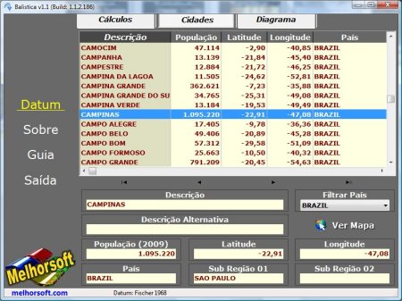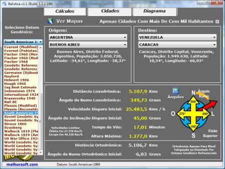 Características Deste Programa Possui banco de dados com informações sobre todas as localidades e cidades do planeta onde estão instaladas populações acima de dez mil habitantes. Os dados populacionais estão baseados em levantamentos realizados no ano de 2009 estando cadastrados um total de 32.707 localidades. Em sua operação, oferece possibilidade de seleção, entre as localidades cadastradas, de dois pontos de interesse: Um ponto de Origem para eventual lançamento de um Projétil Balístico e um ponto de Destino que ele deverá atingir. O programa realiza os cálculos físicos teóricos para definir o disparo do projétil, a partir do ponto de Origem, com propósito de atingir o ponto de Destino. Embora fisicamente corretos, os resultados são teóricos pois, para trajetórias em grandes distâncias, há diversas limitações e variáveis adicionais que poderiam afetar significativamente os resultados. Ele também oferece a possibilidade de consultar individualmete cada localidade do banco de dados, assim como mostrar o mapa geográfico do local. Em particular, este recurso exige que o computador usuário esteja conectado à internet. Por fim, o programa possui um simulador genérico de disparos balísticos que mostra o Alcance, a Altura Máxima, a Distância Alcançada e o Tempo de Vôo para lançamentos em vista da parametrização dos Ângulos de Inclinação e das Velocidades Iniciais de Disparo. Além do banco de dados e das demais funcionalidades oferecidas, uma vez que tenham sido escolhidos dois pontos na superfície do planeta, o programa irá calcular os seguintes parâmetros para disparo a partir da Origem para o Destino: