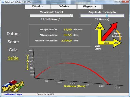 Esta imagem de mapa, aberta em um navegador web padrão, possui os seus próprios controles de navegação e é oferecida por um serviço externo que inclui diversos outros recursos e funcionalidades. Para visualização e disponibilidade destes mapas, é necessário que o computador tenha acesso à internet e ao serviço Google Maps. Caso estas premissas não estejam disponíveis, o mapa não será mostrado. Todavia isto não trará nenhum prejuízo ao funcionamento de todos os demais recursos oferecidos por esta aplicação de software, assim como o acesso ao seu banco de dados, tendo em vista a necessidade de utilização mesmo em caso de eventual confronto de natureza bélica, em que certos recursos possam estar indisponíveis por danos ou influência de forças inimigas. Descritas as funcionalidades do modo "Cidades", seguimos ao modo "Diagrama" cujo acionamento está disponível, por meio de botão, na parte superior da tela. Ao ser acionado o botão "Diagrama" a tela comutará para o seguinte aspecto: Este diagrama consiste em um simulador genérico de disparos balísticos de Artilharia. Ele permite que o operador especifique, na parte superior, com o mouse, por meio de dois controles deslizantes, a Velocidade de Disparo Inicial e o Ângulo de Inclinação do projétil. A ação de arrasto do mouse imediatamente resultará no cálculo do Tempo de Vôo do Projétil, na Altura Máxima alcançada assim como no Alcance Horizontal que será obtido com um disparo naquelas condições. O diagrama de lançamento, mostrado na parte inferior, refletirá a trajetória a ser percorrida pelo projétil caso seja lançado sob aqueles parâmetros físicos. Além dos controles existentes em cada um dos modos, "Cálculos", "Cidades" e "Diagrama", acionáveis por meio dos botões da parte superior, o programa também oferece, no painel esquerdo da tela principal, controles adicionais destinados a configuração do "Datum Geodésico", apresentação e impressão em papel deste "Guia do Usuário", assim como da "Saída do Programa" e do dispositivo "Sobre Este Programa". A configuração de "Datum Geodésico" oferece a possibilidade de definir o Datum que será usado como referência nos cálculos realizados. Esta configuração contém variações de parâmetros que definem o modelo que representa o elipsóide terrestre, que podem afetar os cálculos, sendo que maiores informações estão contidas em seção própria deste manual. A opção "Sobre Este Programa" serve meramente para identificar o número da versão da aplicação e de seu banco de dados: