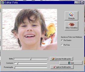 7. Ajuste o Brilho, Contraste e Posterização da foto simplesmente clicando sobre ela, bem como a eliminação dos Olhos Vermelhos das fotos. Se quiser ajustar o tamanho da foto, reduzindo-a ou aumentando, utilize as opções "por dentro" e "por fora", que são auto-explicativas. Da mesma forma, clicando-se sobre legenda, você poderá editar e modificar o texto desejado. Todas as modificações e ajustes feitos aparecem imediatamente no painel inferior da tela, mostrando como está o Álbum.
