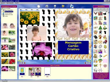 4. Escolha a quantidade de fotos desejadas em cada página, de 0 (zero) a 3 (três). Isto é feito por meio do dispositivo seletor logo abaixo da palavra "Modelos" existente ao lado direito da janela do Cartão Criativo. A transferência de cores de fundo ou imagens é feita de forma muito simples, simplesmente arrastando o modelo desejado sobre a página correspondente do Cartão.